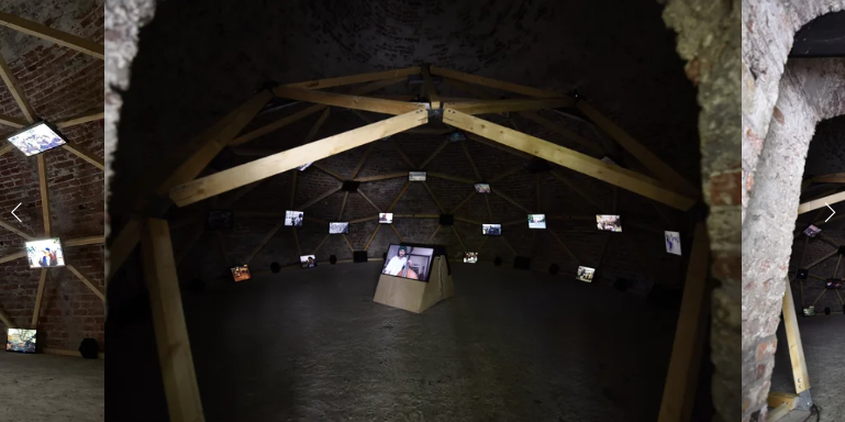 The carefully constructed video installation of the tumultuous news clips is accompanied by a collection of twelve compositions. The artist assembled this soundtrack from improvised jam sessions enacted as artistic responses to the original sounds of the demonstrations, played by six musicians sitting in their pandemic lockdown isolation rooms and collaborating with one another via Zoom. The architectural form within which the elements of the work are gathered evokes a weird sci-fi “situation room” aesthetic—growing into a metaphor for the incomprehensible tension between our incapacity to participate and our yearning for connection and understanding, all while the world is seemingly falling apart, even behind the meter-thick walls of the Pulverturm.