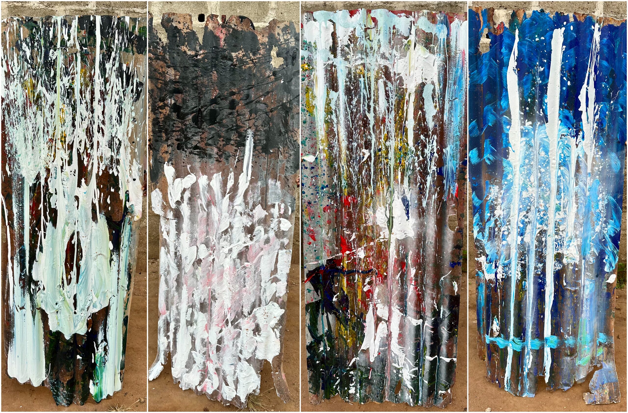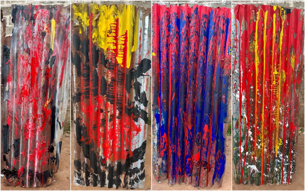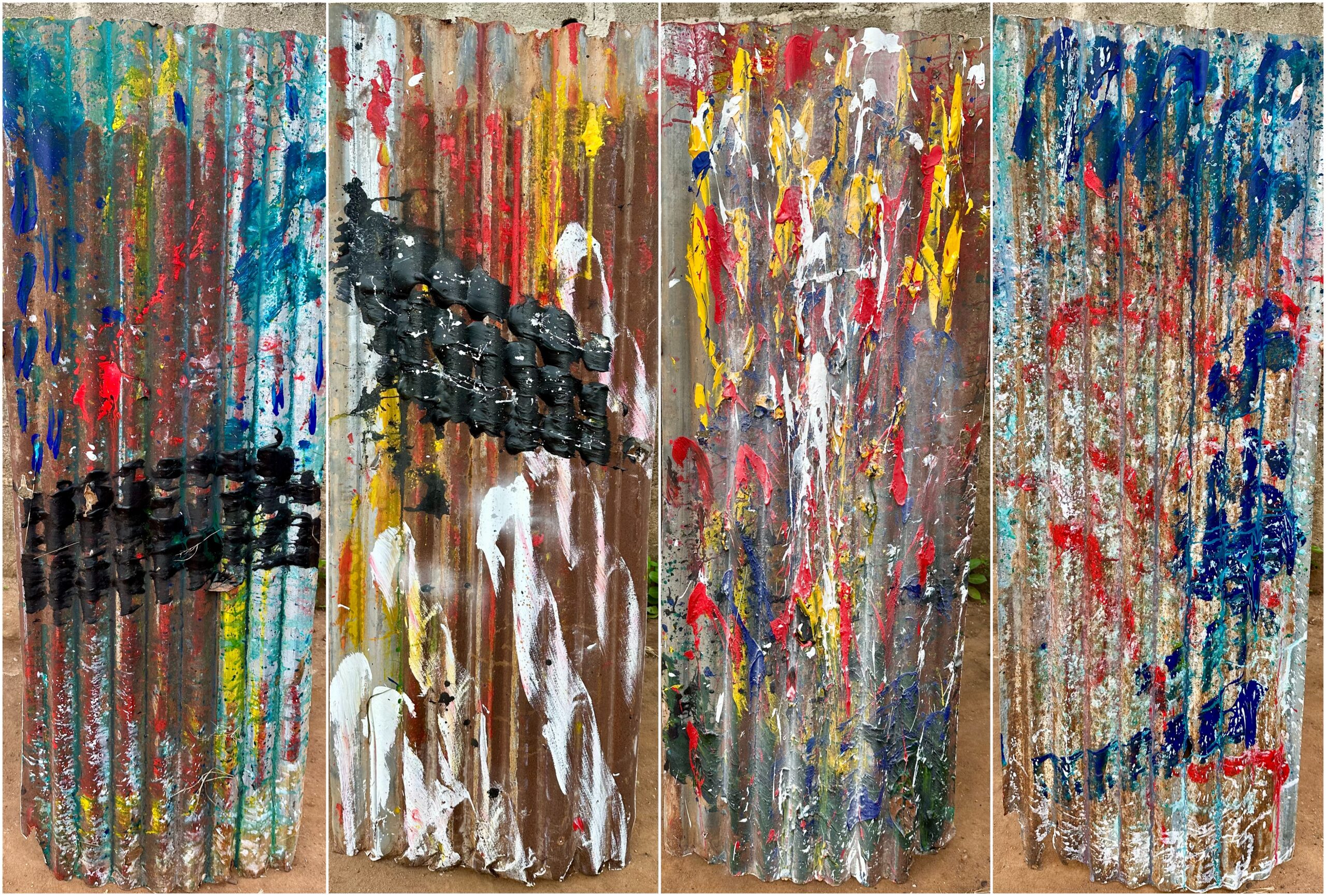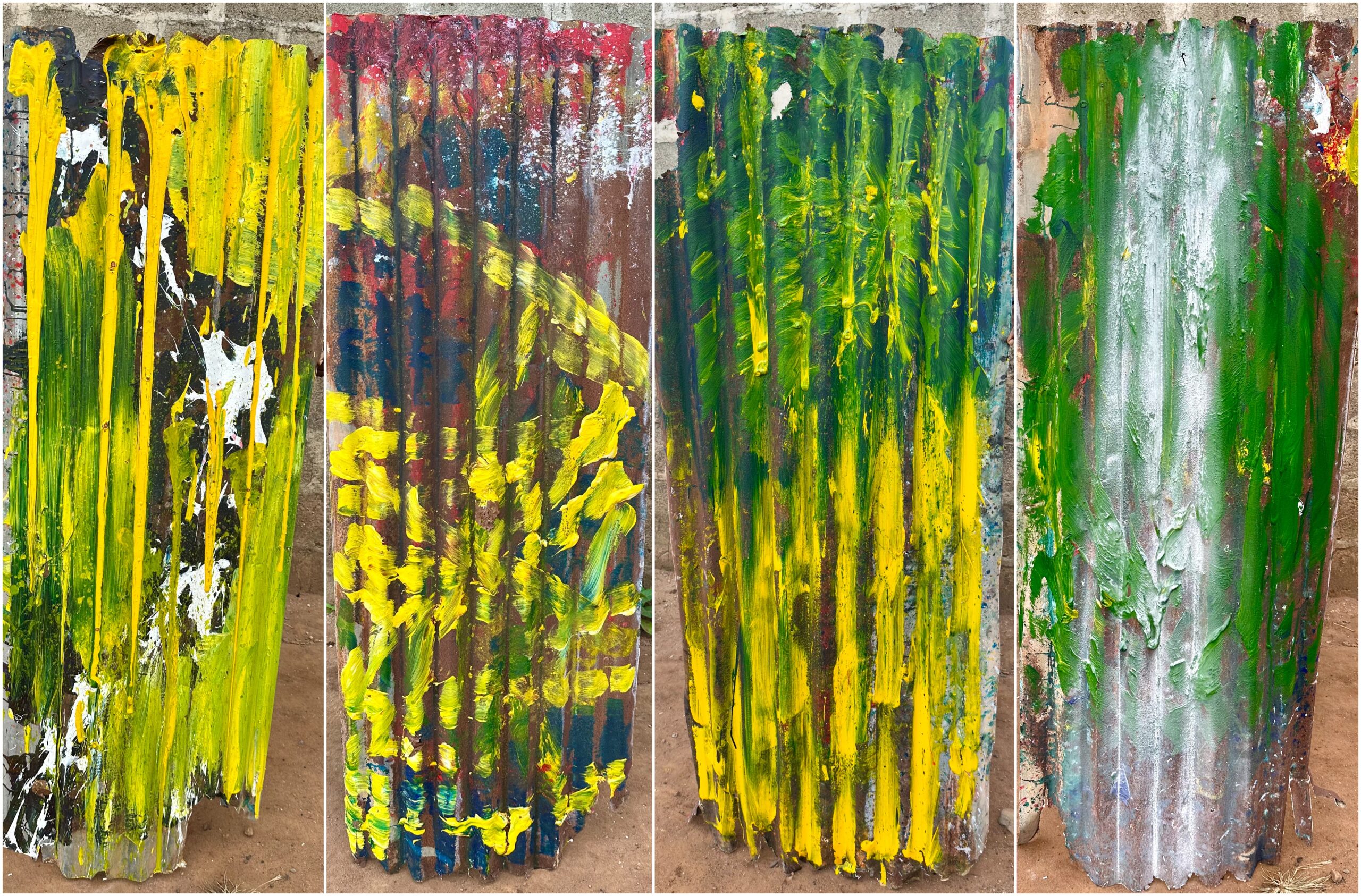 Over the following weeks, I worked within the forest under the guidance of nightly Ifá divination sessions, each one focused on one of the sixteen primary Odù. Each divinatory session—conducted in collaboration with priests and priestesses—informed a painting created that same night. These artworks, rendered primarily on corrugated metal (a material rich with cultural and spiritual significance in Yorùbá architecture and shrine-making), were conceived not as static objects, but as vessels for the energies and narratives of the Odù. They embody a cosmology where colour, myth, and energy converge in ritual form.