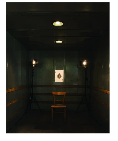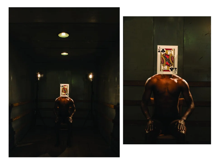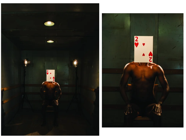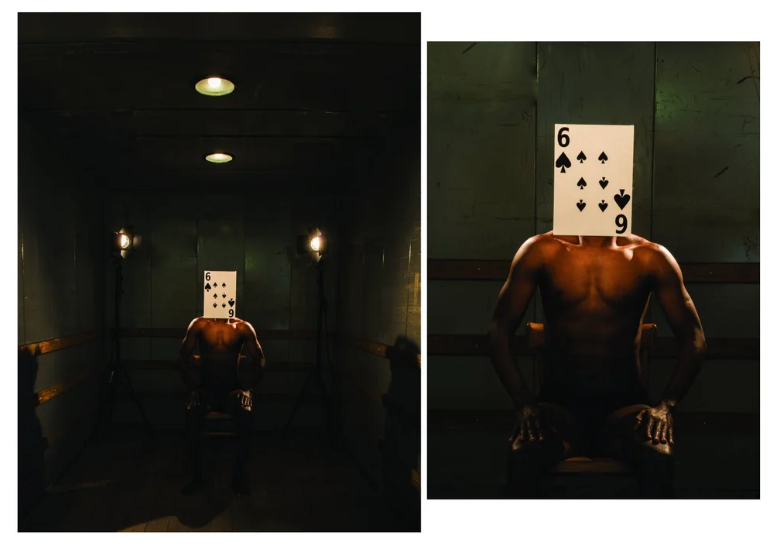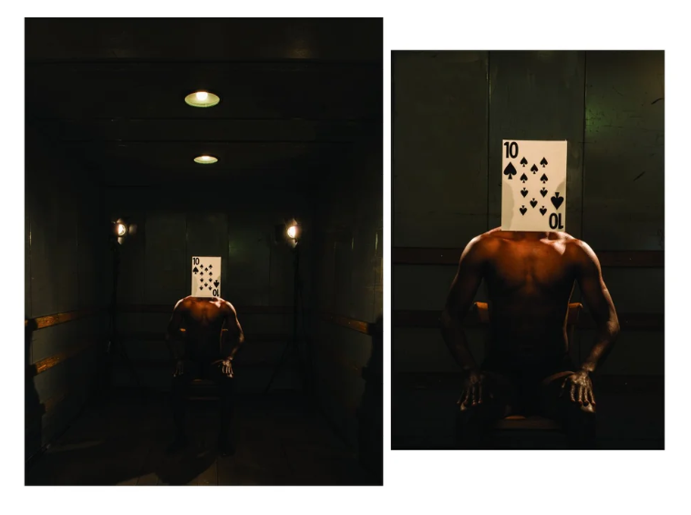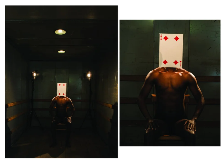 Poker is another performance through photography, executed as part of my residency in Zürich, that continues my dialogue with identity, race, politics, using cinema as a starting point. In this series, race is put on trials; the black skin, is placed on the electric chair, the lights are on, and it’s action time.